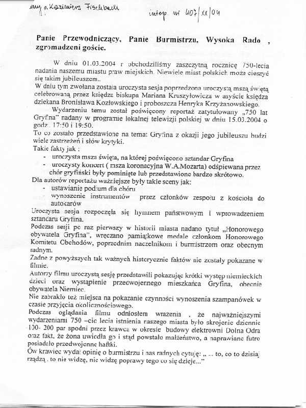 407/XX/04 - ubolewam nad tym, że w uroczystej sesji Rady Miejskiej w Gryfinie, która odbyła się 1 marca br. nie wzięli udziału politycy, którzy deklarują swoją sympatię i przywiązanie do ziemi gryfińskiej. Wynika z tego, że włączyli się w jakieś rozgrywki polityczne, których nie rozumiem. Żałuję, że nie chcieli wspólnie z nami tworzyć najnowszej historii pięknego miasta Gryfina.