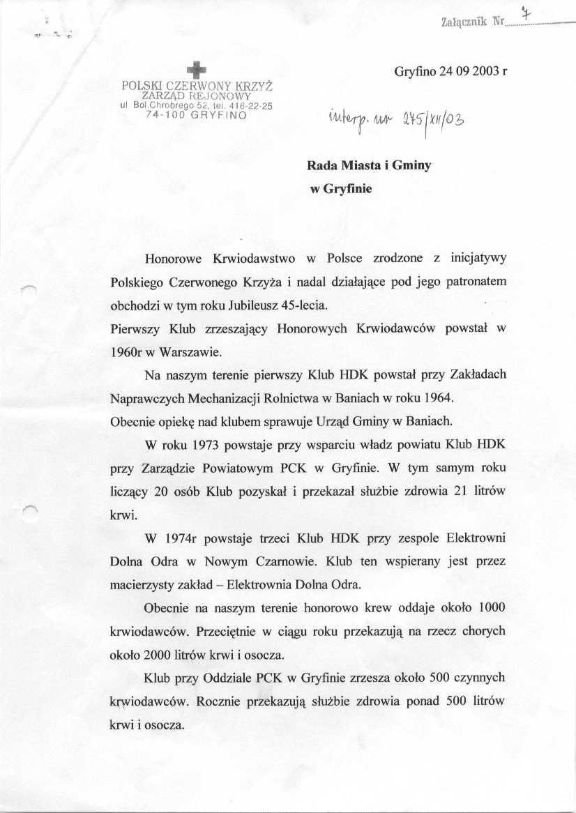 275/XII/03 - Honorowi Dawców Krwi proszą o pomoc finansową na zorganizowanie obchodów 45 – lecia powstania Klubu Honorowych Krwiodawców. Proszą również o pomoc w zorganizowaniu jubileuszu. Chcieli by wiedzieć, czy istnieje możliwość zorganizowania obchodów w sali obrad Urzędu Miasta i Gminy w Gryfinie. Wpłynęło do mnie pismo ( strona1, strona2, strona3, strona4, strona5) w którym Klub Honorowych Dawców Krwi przy PCK w Gryfinie zwraca się do p. Burmistrza z prośbą o objęcie patronatu nad Klubem. Pismo w załączeniu. Władze Miejskie Szczecina zagwarantowały dla Honorowych Dawców Krwi darmowe przejazdy autobusami po Szczecinie. Było by wskazane, aby nasza gmina dla najbardziej zasłużonych dawców krwi również zagwarantowała darmowe przejazdy autobusami.