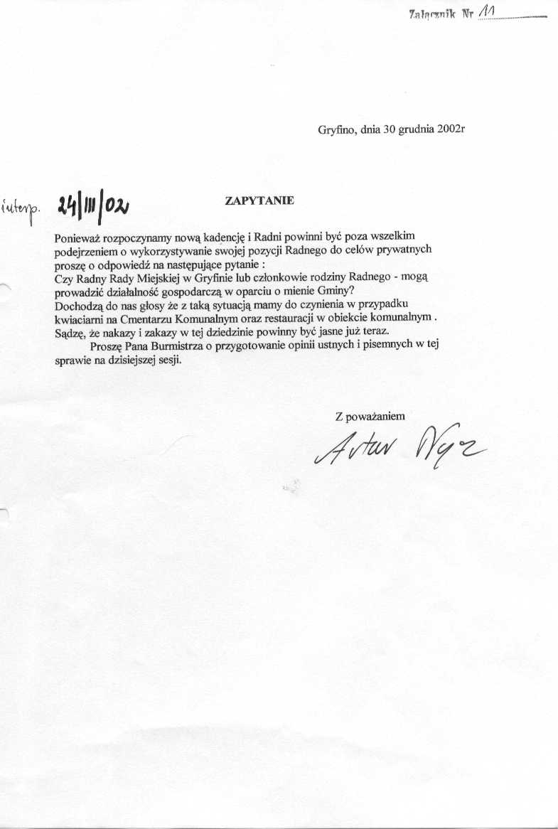 28/III/02 - proszę o dostarczenie mi na piśmie informacji Burmistrza przedstawionej na dzisiejszej sesji o pracach podejmowanych w okresie międzysesyjnym i z wykonania uchwał Rady.