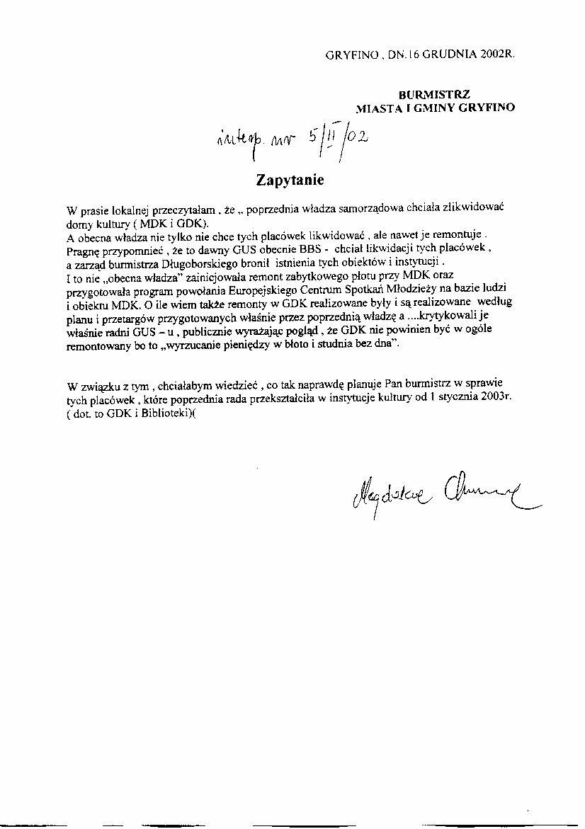 Ad.5/II/02 - nie przypominam sobie, abym kiedykolwiek mówił, że poprzedni Zarząd Miasta i Gminy nie dbał o placówki oświatowe i nie dokładał starań w remontowaniu tych placówek. Nie podpisywałem się nigdy pod takim artykułem prasowym. Chcę powiedzieć, że nadal będziemy dbali o placówki kulturalno – oświatowe, gdyż naszym największym skarbem przed wejściem do Unii będzie dobrze wyszkolona młodzież. Nie może być mowy o ograniczaniu środków finansowych na oświatę i kulturę. Prawdą jest, że GDK oraz Biblioteka w Gryfinie na pewno nie spełniają naszych wymagań na miarę wejścia do Unii.