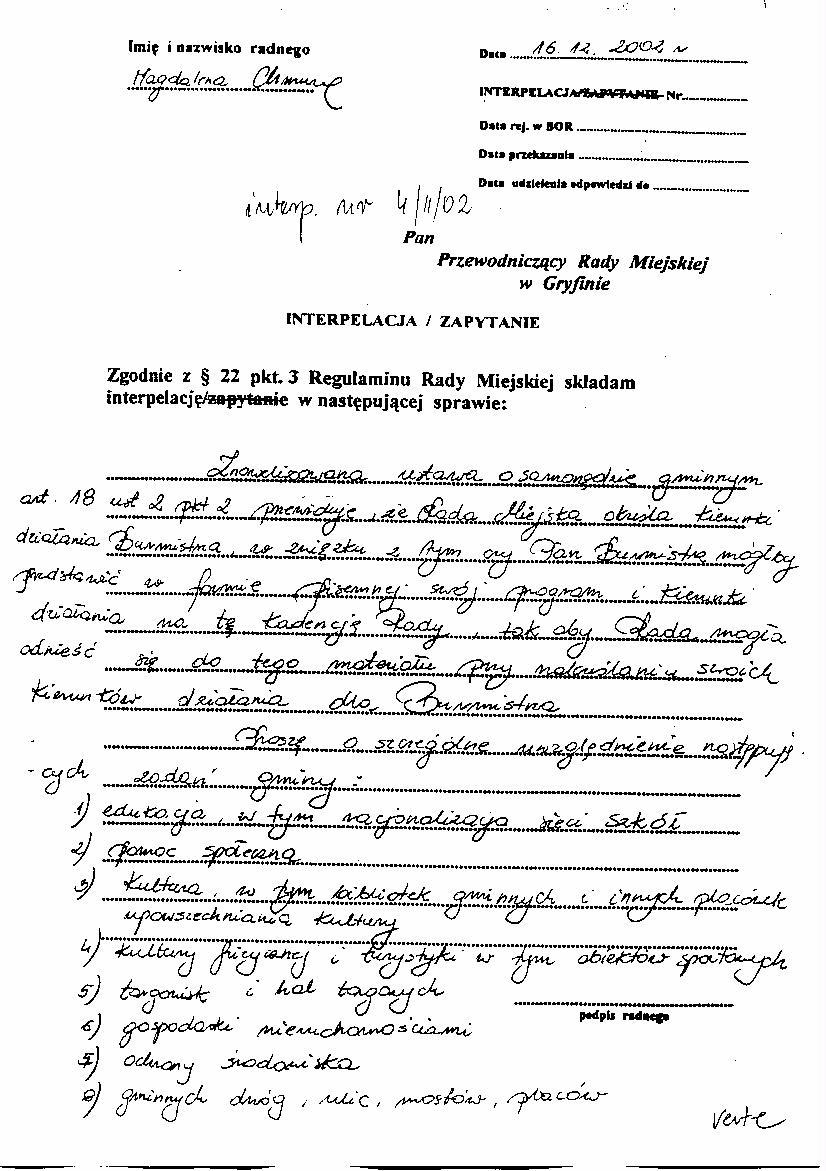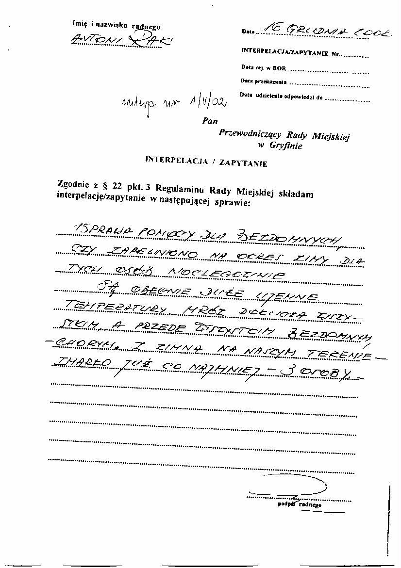 13/II/02 - ponieważ sprawy oświetlenia ulic i remonty dróg są często poruszane w interpelacjach proponuję, aby Pan Burmistrz zorganizował spotkanie z Rejonem Oświetlania Ulic, Generalną Dyrekcją Dróg Krajowych oraz Starostwem. Na spotkaniu wyjaśnimy sprawy, na które od dawna oczekujemy odpowiedzi od w/w instytucji.