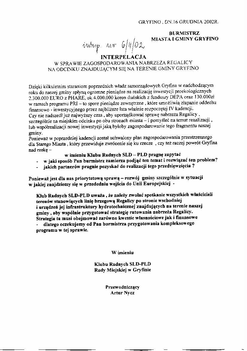14/II/02 - za dwa lata Gryfino będzie obchodziło 750 - lecie nadania praw miejskich. Na Górnym Tarasie w Gryfinie budowany jest nowy kościół. Rozmawiałem z Proboszczem ks. Wojciechem Musiałkiem, który powiedział, że do nowego kościoła potrzebny jest dzwon. Wobec powyższego proponuję rozważyć możliwość ufundowania w/w dzwonu.