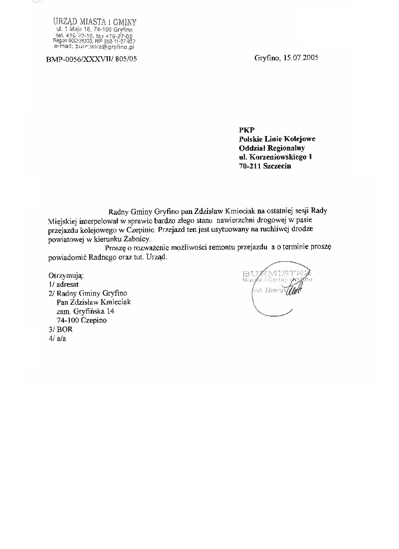 792/XXXVII/05 - z Zachodniopomorskiego Urzędu Wojewódzkiego w Szczecinie otrzymałem odpowiedź na interpelację w sprawie umożliwienieprzejazdu dla samochodów z zamontowaną kratką przez przejście graniczne Gryfino - Mescherin. W ww. piśmie jest zapis, że"posiedzenie polskich i niemieckich ekspertów ds. przejść granicznych odbyło się w dniach 10 - 12 maja 2005 r. w Poczdamie. Na posiedzenie to strona Niemiecka nie uzgodniła tematyki dotyczącej rozszerzenia ruchu na drogowym przejściu granicznym Gryfino - Mescherin o ruch samochodów o całkowitej masie 3,5 t. rejestrowanych w Polsce jako samochody ciężarowe. Stanowisko strony niemieckiej było analogiczne do zajętego przez nią na posiedzeniu odbytym w dniu 29 stycznia 2000 roku w Berlinie, na którym odmówiła ona zgody na dopuszczenie do ruchu na ww. przejściu autobusów liniowych, z powodu braku odpowiedniej infrastruktury drogowej. Wojewoda Zachodniopomorski przychylając się do postulatów władz Miasta i Gminy oraz Powiatu Gryfino pismem z dnia 8 września 2004 r. zwrócił się do Zarządu Granicznego Komendy Głównej Straży Granicznej o dopuszczenie do ruchu na przejściu granicznym Gryfino - Mescherin samochodów o całkowitej masie do 3,5t. W odpowiedzi Komenda wskazała na konieczność podpisania odpowiedniego porozumienia między Rządem Rzeczypospolitej Polskiej, a Rządem republiki Federalnej Niemiec. Komenda podkreśliła przy tym, iż inicjatywa w tej sprawie należy do strony niemieckiej. W tej sytuacji Wojewoda Zachodniopomorski nie mógł ponowić wystąpienia do Ministra Spraw Wewnętrznych i Administracji RP. Obecnie korzystne rozstrzygnięcie mogłyby zapewnić działania radnych Rady Miejskiej w Gryfinie w ramach partnerskiej współpracy transgranicznej na rzecz zgłoszenia przez stronę niemiecką wniosku oczekiwanego przez stronę polską". Proszę p. Burmistrza o wystąpienie do samorządu niemieckiego z prośbą, o zgłoszenie wniosku w tej sprawie. Proszę również p. Starostę Powiatu Gryfińskiego o złożenie takiego wniosku.