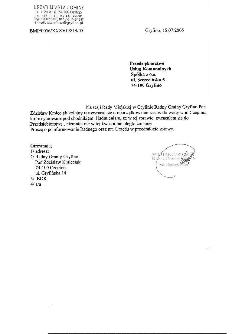 Ad.807/XXXVII/05 - na drugi dzień po pożarze w Czepinie omówiono akcję ratunkową w obecności Komendanta Straży Pożarnej p. Tessara, Prezesa PUK p. Muchy. Na złą akcje ratunkową złożyło się wiele przyczyn. Jedną z nich był brak wody w hydrantach. Straż Pożarna zapomniała, że w Czepinie oraz Daleszewie są zbiorniki p. pożarowe, przy zakopywaniu których brał udział Komendant Straży Pożarnej p. Tessar oraz nieżyjąca już p. Marzena Czachur. Przy gaszeniu pożaru popełniono szereg błędów. Nie może być również tak, że odłącza się prąd dla całego miasta i nie powiadamia o tym PUK. Gdyby zawiadomiono PUK, to włączono by agregat prądotwórczy. Każde nasze ujęcie wodne posiada taki agregat. Zaleciłem wykonanie przeglądu wszystkich hydrantów. W miejscach strategicznych nastąpi wymiana hydrantów na nowe.