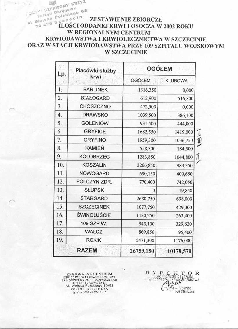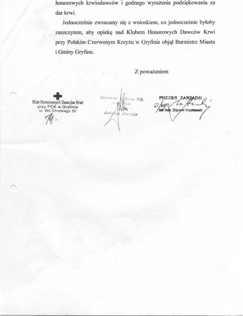 275/XII/03 - Honorowi Dawców Krwi proszą o pomoc finansową na zorganizowanie obchodów 45 – lecia powstania Klubu Honorowych Krwiodawców. Proszą również o pomoc w zorganizowaniu jubileuszu. Chcieli by wiedzieć, czy istnieje możliwość zorganizowania obchodów w sali obrad Urzędu Miasta i Gminy w Gryfinie. Wpłynęło do mnie pismo ( strona1, strona2, strona3, strona4, strona5) w którym Klub Honorowych Dawców Krwi przy PCK w Gryfinie zwraca się do p. Burmistrza z prośbą o objęcie patronatu nad Klubem. Pismo w załączeniu. Władze Miejskie Szczecina zagwarantowały dla Honorowych Dawców Krwi darmowe przejazdy autobusami po Szczecinie. Było by wskazane, aby nasza gmina dla najbardziej zasłużonych dawców krwi również zagwarantowała darmowe przejazdy autobusami.