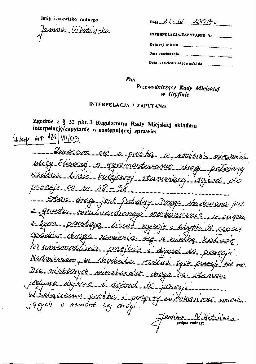 135/VII/03 - interpelacja w załączeniu (strona 1, strona 2, strona 3).