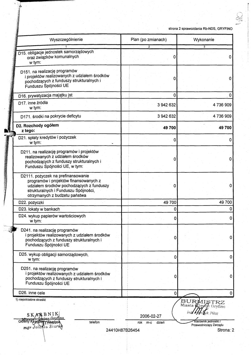 Dane dotyczące aktualnego zadłużenia, znajdują się w załącznikun nr 16. do Uchwały Nr XLV/569/05 Rady Miejskiej w Gryfinie dnia 22 grudnia 2005r. stanowiącym załącznik nr 3 do pisma znak: SKF-kredyt długoterminowy /01/06